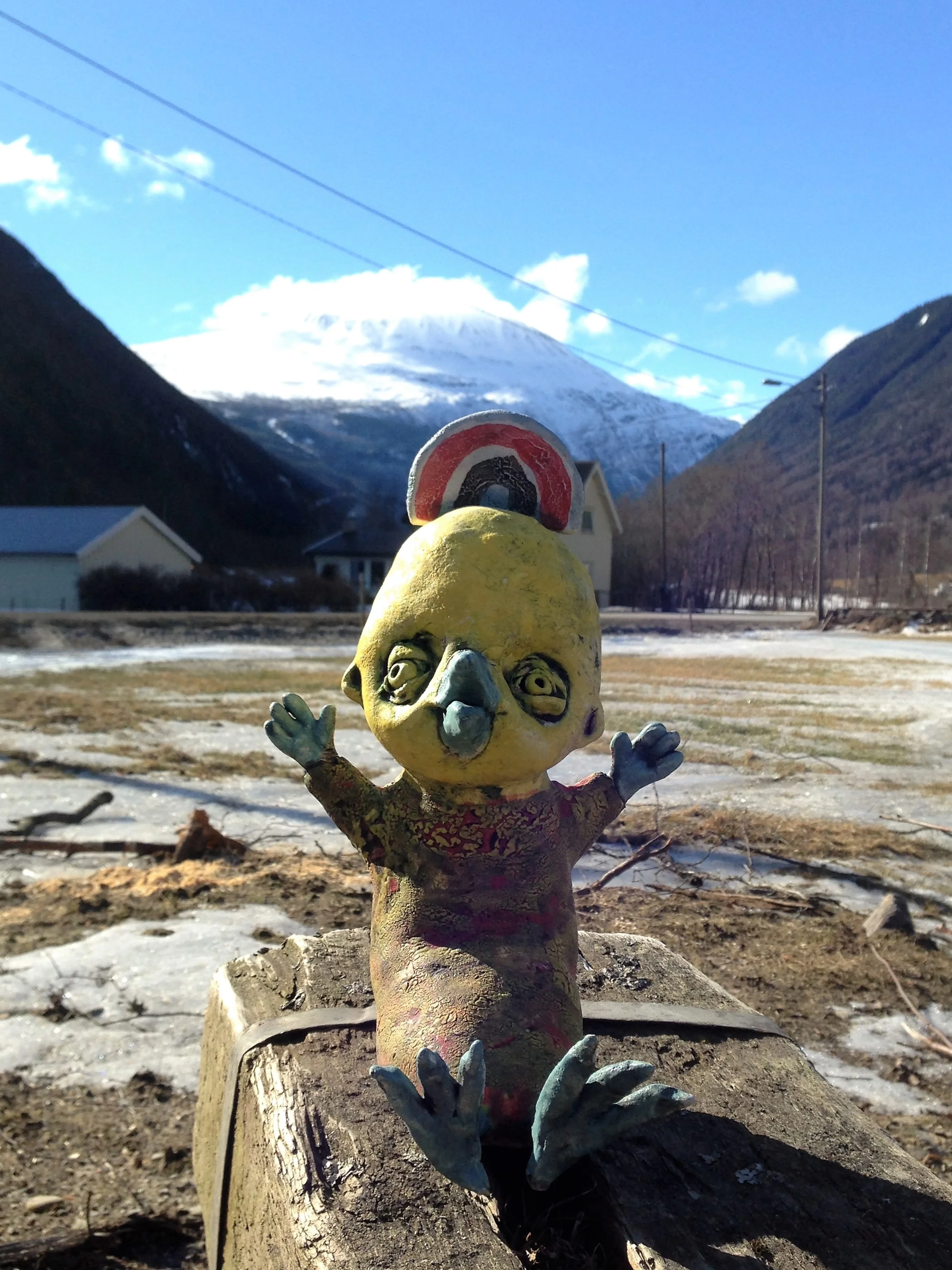 Sinah sin lykkelige dag. Endelig ute av hønsegården og på tur ut i verden. Strålende sol, og Telemarks vakre mor, Gaustatoppen, i bakgrunnen.